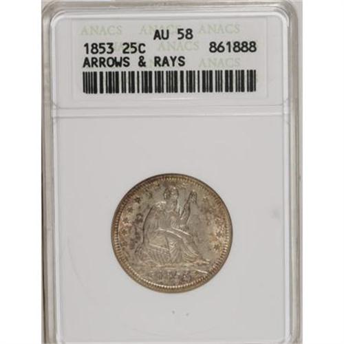 <B>1853 25C Arrows and Rays AU58 ANACS.</B></I> NGC Census: (102/352). PCGS Population (77/302). Mintage: 15,210,020. Numismedia Wsl. Price for NGC/PCGS coin in AU58: $442. (#5426)<BR><BR><B>Coin Engraver:</B> Christian Gobrecht<BR><BR><b>Shipping:</b> Coins & Currency (<a target="_blank" href="http://www.heritageauctions.com/common/shipping.php">view shipping information</a>)