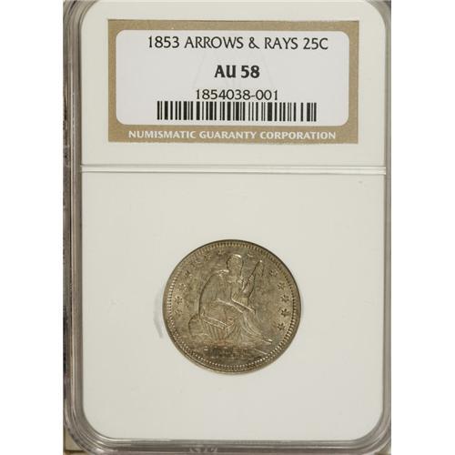<B>1853 25C Arrows and Rays AU58 NGC.</B></I> NGC Census: (97/341). PCGS Population (72/288). Mintage: 15,210,020. Numismedia Wsl. Price: $442. (#5426)<BR><BR><b>Shipping:</b> Coins & Currency (<a target="_blank" href="http://www.heritageauctions.com/common/shipping.php">view shipping information</a>)