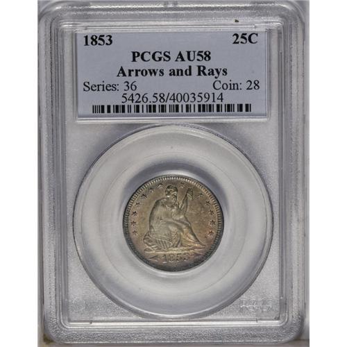 <B>1853<25C> Arrows and Rays AU58 PCGS.</B></I> A coin with mellow fields and light friction on the devices. Subtle red and orange toning over the obverse gives way to attractive gunmetal and orange toning on the reverse. This coin could be displayed well reverse-up to show the rays around the eagle.