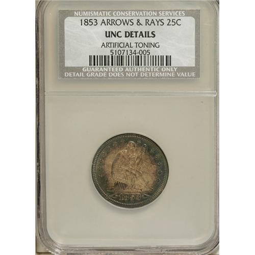 <B>1853 25C Arrows and Rays--Artificially Toned--NCS. Unc Details.</B></I> NGC Census: (0/0). PCGS Population (0/0). Mintage: 15,210,020. (#5426)<BR><BR><b>Shipping:</b> Coins & Currency (<a target="_blank" href="http://www.heritageauctions.com/common/shipping.php">view shipping information</a>)