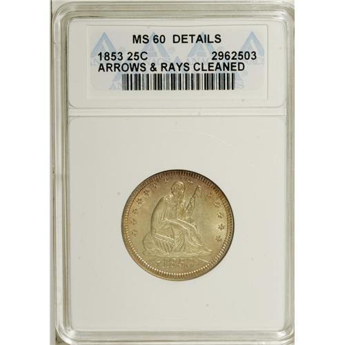 <B>1853 25C Arrows and Rays--Cleaned--ANACS. MS60 Details.</B></I> A lustrous light gold example of this popular single-year type. Well struck and unblemished with little evidence of a prior cleaning.<BR><BR><b>Shipping:</b> Coins & Currency (<a target="_blank" href="http://www.heritageauctions.com/common/shipping.php">view shipping information</a>)