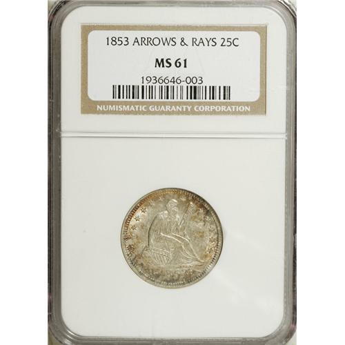 <B>1853 25C Arrows and Rays MS61 NGC.</B></I> Multicolored iridescence adorns the obverse and reverse peripheries. Boldly struck, lustrous, and nicely preserved, with a few faint hairlines noted in the obverse fields. A desirable one-year type coin.<BR><BR><b>Shipping:</b> Coins & Currency (<a target="_blank" href="http://www.heritageauctions.com/common/shipping.php">view shipping information</a>)