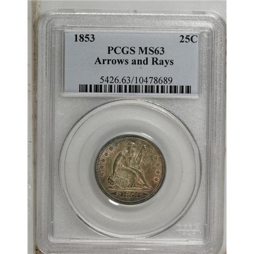 <B>1853<25C> Arrows and Rays MS63 PCGS.</B></I> Reddish-orange toning covers the obverse, while pleasing plum patina appears on the reverse. A crisply struck and lustrous coin that would fit well in a toned type set.