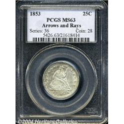 <B>1853<25C> Arrows and Rays MS63 PCGS.</B></I> A desirable one year type coin exhibiting some light, natural patina. Each side exhibits varying degrees of visible roller marks and weakness of strike is pronounced in these areas, the grade-limiting factor. The peripheral details remain sharp. A worthwhile, collectible Select example. <BR><BR><B>Important notice:</B> Heritage usually auctions material at the rate of 200-250 lots per hour. On some occasions eBay Live bid software or the Internet may not be able to keep up with the pace of the auction. We recommend placing a realistic absentee bid now as insurance to avoid disappointment. Occasionally the auctioneer may eliminate or reject an eBay Live bid, and the auctioneer may also reopen a lot after the close of the eBay live bidding (usually because we missed an audience bid), and may reject your bid even if it shows you as the winning bidder. By bidding via eBay Live, you agree that Heritage may award the lot to another bidder at its sole discretion under the circumstances described above or any other reasonable circumstances. Since eBay bids are not shown to us until we open the lot on the floor, we treat those bids just like floor bids. In most cases the floor responds before the eBay bid is presented to us, due to Internet lag time, so for consistency we have made it a policy that floor bids are always considered first over tie eBay live bids. Also please note that all Heritage lots purchased through eBay Live carry a 20% Buyer's Premium. Please make sure you read the Terms and Conditions before you bid. </span></font></tr></table></td></tr></table>