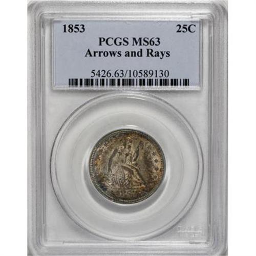 <B>1853 25C Arrows and Rays MS63 PCGS.</B></I> Whispers of reddish-gold, golden-brown, and cobalt-blue toning<B> </B></I>race over lustrous surfaces. A well directed strike brings out sharpness on the design elements. An excellent type coin.<BR><I>From The Beau Clerc Collection.</B></I><BR><BR><B>Coin Engraver:</B> Christian Gobrecht<BR><BR><b>Shipping:</b> Coins & Currency (<a target="_blank" href="http://www.heritageauctions.com/common/shipping.php">view shipping information</a>)