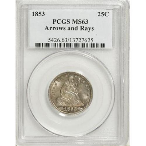 <B>1853 25C Arrows and Rays MS63 PCGS.</B></I> For the grade, this is a sensational Arrows and Rays type coin. The surfaces are bright with light silver that is accented by hints of gold and blue color. Both sides are sharply detailed and softly frosty.<BR><BR><B>Coin Engraver:</B> Christian Gobrecht<BR><BR><b>Shipping:</b> Coins & Currency (<a target="_blank" href="http://www.heritageauctions.com/common/shipping.php">view shipping information</a>)