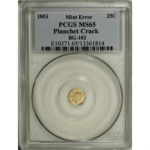 <B>1853 25C Liberty Octagonal 25 Cents, BG-102, Low R.4--Planchet Crack--MS65 PCGS.</B></I> A beautiful butter-gold Gem that has a solitary blush of subtle rose toning near 8 o'clock on the reverse. Essentially pristine aside from a slender mint-made crack from 6:30 to the upper back of Liberty's neck. Population: 2 in 65, 0 finer (12/07).<BR><BR><b>Shipping:</b> Coins & Currency (<a target="_blank" href="http://www.heritageauctions.com/common/shipping.php">view shipping information</a>)