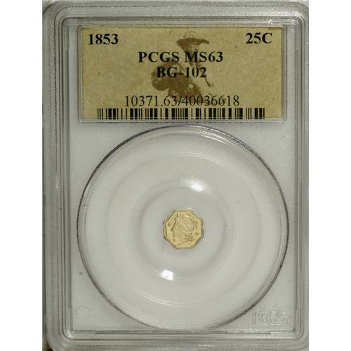 <B>1853 25C Liberty Octagonal 25 Cents, BG-102, Low R.4, MS63 PCGS.</B></I> PCGS Population (36/16). NGC Census: (2/2). (#10371)<BR><BR><b>Shipping:</b> Coins & Currency (<a target="_blank" href="http://www.heritageauctions.com/common/shipping.php">view shipping information</a>)