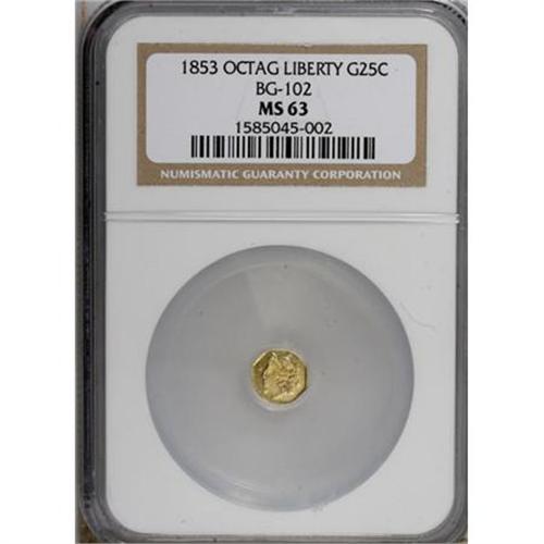 <B>1853 25C Liberty Octagonal 25 Cents, BG-102, Low R.4, MS63 NGC.</B></I> NGC Census: (3/4). PCGS Population (37/17). (#10371)<BR><BR><b>Shipping:</b> Coins & Currency (<a target="_blank" href="http://www.heritageauctions.com/common/shipping.php">view shipping information</a>)