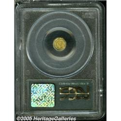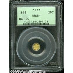 <B>1853 25C Liberty Octagonal 25 Cents, BG-102, Low R.4, MS64 PCGS.</B></I> Peach and aqua hues enrich the canary-gold surfaces of this well preserved and problem-free Fractional Gold piece. The 8 in the date is weak, as is usual for this Period One variety. In a green label holder. Population: 15 in 64, 1 finer (2/05).