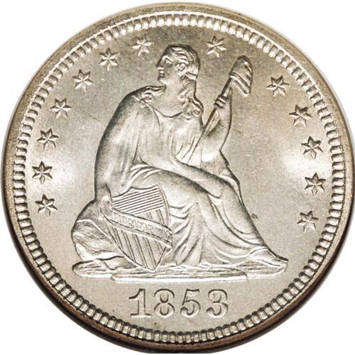 <B>1853 25C No Arrows MS67 NGC.</B></I> Briggs 1-A. The <I>Guide Book</B></I> reports a mintage of more than 15 million pieces for the 1853 Arrows and Rays issue. But the No Arrows variety is significantly scarcer, since just 44,200 pieces were produced. These feature a boldly repunched 53 in the date. There was little need to strike the No Arrows issue in quantity, since the pieces were likely to be promptly hoarded from circulation. This penetratingly struck Superb Gem is brilliant save for a hint of tan toning. The lustrous fields lack any indication of contact, and in fact there is no apparent reason why this piece did not receive an even finer grade. Census: 3 in 67, 1 finer (10/06).<BR><BR><b>Shipping:</b> Coin/Currency (<a target="_blank" href="http://www.heritageauctions.com/common/shipping.php">view shipping information</a>)