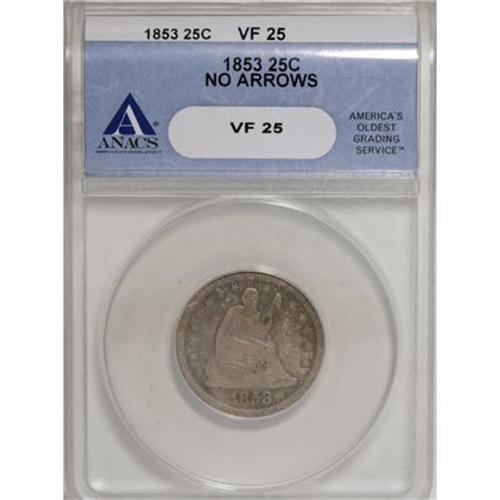 <B>1853 25C No Arrows VF25 ANACS.</B></I> Olive-green and mauve colors rest over the relatively clean surfaces of this No Arrows quarter. Generally defined, including a fairly strong LIBERTY.<BR><I>From The John Stimson, Sr. Collection, Part Two.</B></I><BR><BR><B>Coin Engraver:</B> Christian Gobrecht<BR><BR><b>Shipping:</b> Coins & Currency (<a target="_blank" href="http://www.heritageauctions.com/common/shipping.php">view shipping information</a>)