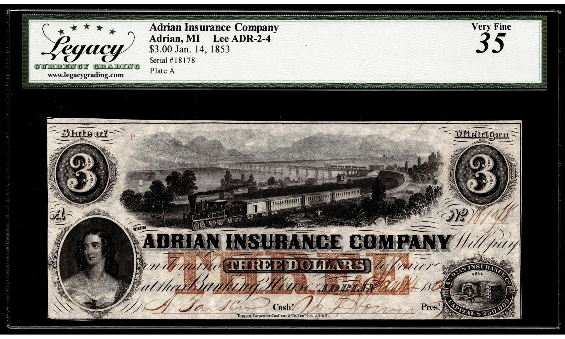 One 1853 $3 Adrian Insurance Company Adrian, MI Obsolete Note Legacy Very Fine 35. Legacy Graded.