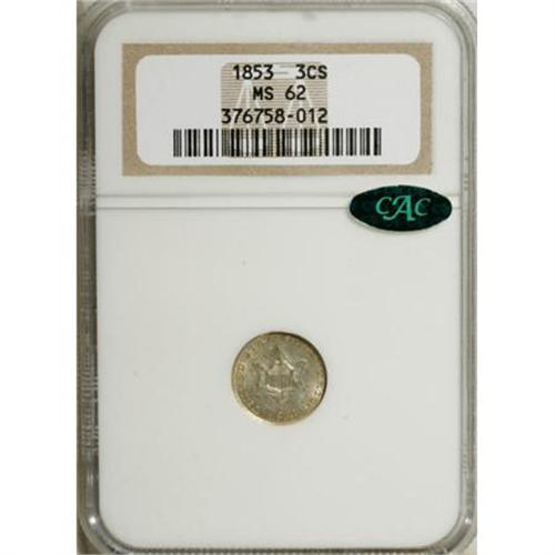 <B>1853 3CS MS62 NGC. CAC.</B></I> Bold clash marks appear on both sides of this silver-gold piece, with good luster but a few tiny field marks and scrapes limiting a finer grade.<BR><I>From The Southwest Collection.</B></I><BR><BR><B>Coin Engraver:</B> James B. Longacre<BR><BR><b>Shipping:</b> Coins & Currency (<a target="_blank" href="http://www.heritageauctions.com/common/shipping.php">view shipping information</a>)