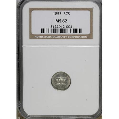 <B>1853 3CS MS62 NGC.</B></I> NGC Census: (71/434). PCGS Population (84/442). Mintage: 11,400,000. Numismedia Wsl. Price for NGC/PCGS coin in MS62: $175. (#3667)<BR><BR><B>Coin Engraver:</B> James B. Longacre<BR><BR><b>Shipping:</b> Coins & Currency (<a target="_blank" href="http://www.heritageauctions.com/common/shipping.php">view shipping information</a>)