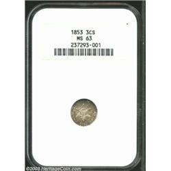 1853 3CS MS63 NGC. Well defined, each side retains a fair amount of original brilliance with speckle