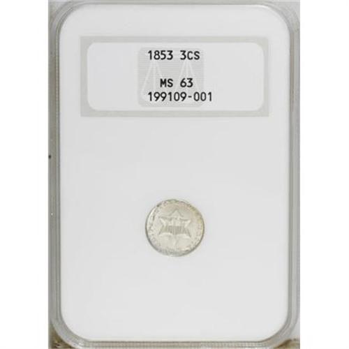 <B>1853 3CS MS63 NGC.</B></I> NGC Census: (117/315). PCGS Population (141/300). Mintage: 11,400,000. Numismedia Wsl. Price for NGC/PCGS coin in MS63: $230. (#3667)<BR><BR><B>Coin Engraver:</B> James B. Longacre<BR><BR><b>Shipping:</b> Coins & Currency (<a target="_blank" href="http://www.heritageauctions.com/common/shipping.php">view shipping information</a>)