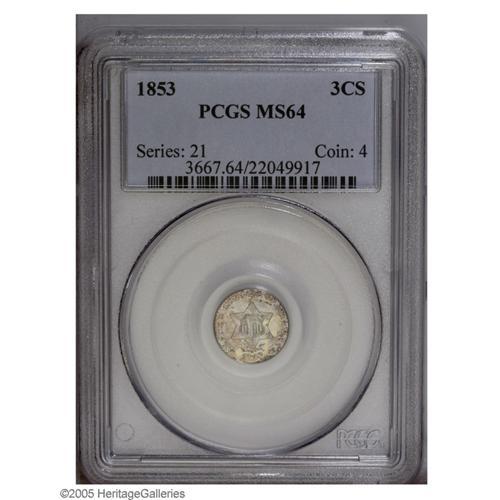 <B>1853<3CS> MS64 PCGS.</B></I> Speckles of brown toning dance over lustrous surfaces that exhibit sharply struck design elements. Well preserved surfaces are free of significant marks.