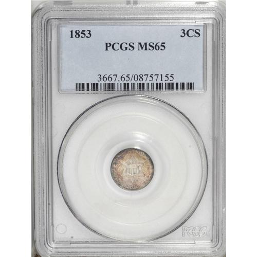 <B>1853<3CS> MS65 PCGS.</B></I> A lovely Gem example of this Type One issue, significant for type and date collectors. Lustrous and boldly struck with lemon-yellow and magenta patina.