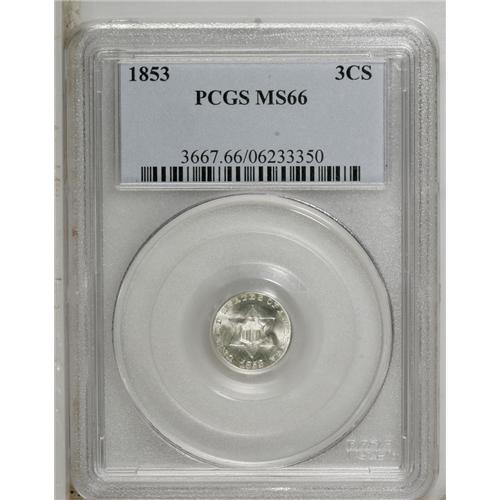 1853 3CS MS66 PCGS. A gleaming piece that has the slig