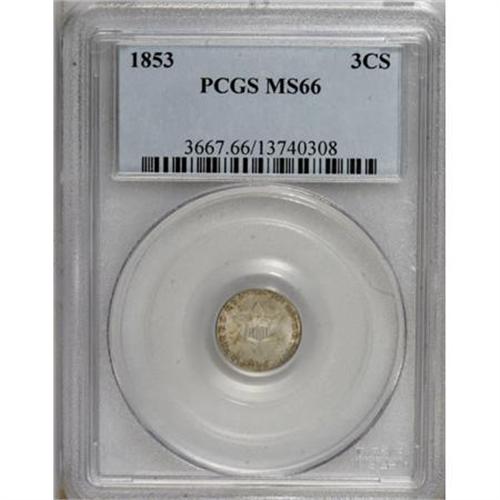 <B>1853 3CS MS66 PCGS.</B></I> Gunmetal-gray, ice-blue, and golden-brown confirm the originality of this satiny and undisturbed Premium Gem. The shield is well struck. Population: 43 in 66, 5 finer (8/07).<BR><BR><B>Coin Engraver:</B> James B. Longacre<BR><BR><b>Shipping:</b> Coins & Currency (<a target="_blank" href="http://www.heritageauctions.com/common/shipping.php">view shipping information</a>)