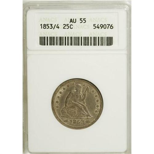 <B>1853/4 25C Arrows and Rays AU55 ANACS.</B></I> Blushes of sky-blue and orange patina visit both sides of this sharply struck, Choice AU quarter. Traces of luster reside in the recesses of the mainly clean surfaces. According to Larry Briggs (1991): "8 and 5 are repunched figures slightly left of original punched 85. The 3 of date is punched over an erroneous so-called 4, with vertical bar of such, plain on left inside portion of 3 in early die state; right shaft and top rear portion of arrow also sharply repunched. In late state, repunched arrow shaft is usually only portion left indicating the 'overdate' die." On this intermediate die state example, the clearest repunching is seen on the 8, 5 and arrow shaft.<BR><BR><B>Coin Engraver:</B> Christian Gobrecht<BR><BR><b>Shipping:</b> Coins & Currency (<a target="_blank" href="http://www.heritageauctions.com/common/shipping.php">view shipping information</a>)