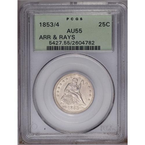 1853/4 25C Arrows and Rays AU55 PCGS. FS-003, Briggs 1 1853/4[25C] Arrows and Rays AU55 PCGS.