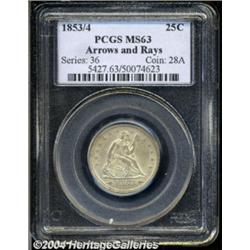 <table><tbody><tr><td><table> <TR><TD width="100%"><TABLE cellSpacing=1 cellPadding=3 width="100%" border=0><TBODY><TR><TD width="100%" bgColor=#79735c><FONT face=arial color=#ffffff size=3><B>Description</B> </FONT></TD></TR><TR><TD width="100%" bgColor=#ffffff><FONT face=arial size=2><B>1853/4 25C Arrows and Rays MS63 PCGS.</B></I> FS-003. Briggs 1-A. In his book on Seated Quarters, Larry Briggs raises some doubt as to this variety's status as an 1853/4 overdate. Under magnification, one can definitely see that the last three digits in the date have been punched over partially effaced underdigits. Remnants of the latter are visible within the upper loop of the 8, along the outside stand of the 5, and within the upper loop of the 3. In addition, the right arrow shaft on the obverse has also been repunched. While the exact identity of the underdigits is open to question, there is no doubt that this is a scarce variety that should be considered a significant find in Mint State. The Select example offered here appear to qualify for Condition Census status. The surfaces are minimally marked for the grade with a glowing, satiny sheen beneath milky olive-gold patina. Population: 5 in 63, 1 finer (10/03). </FONT></TD></TR></TBODY></TABLE></TD></TR></TBODY></TABLE><BR><A name=PricesRealized></A><TABLE cellSpacing=0 cellPadding=0 width="100%" bgColor=#000000 border=0><TBODY><TR><TD width="100%"><TABLE cellSpacing=1 cellPadding=3 width="100%" border=0><TBODY><TR><TD width="100%" bgColor=#79735c><A name=PR><FONT face=arial color=#ffffff size=3><B>Previous Prices from Heritage Auctions</B> </FONT></A></TD></TR><TR><TD bgColor=#f6f6ed><TABLE cellSpacing=0 cellPadding=0 width="100%" border=1><TBODY><TR><TD align=middle width="33%"><B>Date</B></TD><TD align=middle width="33%"><B>Service</B></TD><TD align=middle width="33%"><B>Price</B></TD></TR><TR bgColor=whitesmoke><TD width="33%"><B>08/07/2000</B></TD><TD width="33%">PCGS</TD><TD width="33%">$4,140.00</TD></TR></TBODY></TABLE></TD></TR><TR><TD bgColor=#ffffff><FONT face=arial size=1 ?>PLEASE NOTE: All prices realized reflect the final hammer price PLUS the buyer's premium in auctions that charge a buyer's premium. Each item has a notation at the top of the listing indicating whether that lot included a buyer's premium. Example: A item that sells with a final hammer price of $100 and a 20% buyer's premium will display with a price realized of $120. All information listed is intended to be as accurate as possible, but errors are possible. Please use this guide carefully and inform us of any inaccuracies. </FONT></TD></TR></TBODY></TABLE></TD></TR></TBODY></TABLE><BR><TABLE cellSpacing=0 cellPadding=0 width="100%" bgColor=#000000 border=0><TBODY><TR><TD width="100%"><TABLE cellSpacing=1 cellPadding=3 width="100%" border=0><TBODY><TR><TD width="100%" bgColor=#79735c colSpan=6><FONT face=arial color=#ffffff size=3><B>Price Guide*</B> </FONT></TD></TR><TR bgColor=#f6f6ed><TD align=middle><B>Grade</B> </TD><TD align=middle><B>Coin World<BR>(Trends)</B> </TD><TD align=middle><B>Numismedia<BR>Retail</B> </TD><TD align=middle><B>Numismedia<BR>Wholesale</B> </TD><TD align=middle><B>Coin<BR>Universe</B> </TD><TD align=middle><B>Heritage<BR>Value Index</B> </TD></TR><TR bgColor=#ffffff><TD align=middle>62</TD><TD align=right>$5,000.00</TD><TD align=right>---</TD><TD align=right>$2,625.00</TD><TD align=right>---</TD><TD align=right>$2,759.38</TD></TR><TR style="FONT-WEIGHT: bold" bgColor=#cccfdd><TD align=middle>63</TD><TD align=right>$12,000.00</TD><TD align=right>---</TD><TD align=right>$4,140.00</TD><TD align=right>$5,075.00</TD><TD align=right>$5,214.17</TD></TR><TR bgColor=#ffffff><TD align=middle>64</TD><TD align=right>$25,000.00</TD><TD align=right>---</TD><TD align=right>---</TD><TD align=right>---</TD><TD align=right>$12,800.00</TD></TR><TR bgColor=#ffffff><TD colSpan=6><FONT size=1>*All information listed is intended to be as accurate as possible, but errors are possible. No item may be returned or refused based on this information which is provided as a service to our customers. You should contact each pricing source directly to determine the accuracy of this information. </FONT></TD></TR></TBODY></TABLE></TD></TR></TBODY></TABLE><BR><TABLE cellSpacing=0 cellPadding=0 width="100%" bgColor=#000000 border=0><TBODY><TR><TD width="100%"><TABLE cellSpacing=1 cellPadding=3 width="100%" border=0><TBODY><TR><TD width="100%" bgColor=#79735c><FONT face=arial color=#ffffff size=3><B>Population Guide</B> </FONT></TD></TR><TR bgColor=#ffffff><TD align=middle><!-- Begin Output of Population Grid--><TABLE cellSpacing=0 cellPadding=0 width="100%" border=0><TBODY><TR><TD vAlign=center><TABLE cellSpacing=0 width="100%" border=1 cellsadding="3"><TBODY><TR><TD vAlign=center><TABLE cellSpacing=0 cellPadding=3 width="100%" border=1><TBODY><TR><TD vAlign=center align=middle bgColor=#f0f1e8 colSpan=2 <CENTER><FONT face=Arial size=2><B>PCGS Pop </B></FONT><CENTER></CENTER></TD><TD vAlign=center align=middle bgColor=#f0f1e8 colSpan=2><CENTER><FONT face=Arial size=2><B>NGC Pop</B></CENTER></FONT></TD></TR><TR><TD vAlign=center><FONT face=Arial size=2>(63)</FONT> </TD><TD vAlign=center align=right><FONT face=Arial size=2>5</FONT> </TD><TD vAlign=center><FONT face=Arial size=2>(63)</FONT> </TD><TD vAlign=center align=right><FONT face=Arial size=2>3</FONT> </TD></TR><TR><TD vAlign=center><FONT face=Arial size=2>(>63)</FONT> </TD><TD vAlign=center align=right><FONT face=Arial size=2>1</FONT> </TD><TD vAlign=center><FONT face=Arial size=2>(>63)</FONT> </TD><TD vAlign=center align=right><FONT face=Arial size=2>0</FONT> </TD></TR></TBODY></TABLE></TD></TR></TBODY></TABLE></TD></TR></TBODY></TABLE><!-- End Output of Population Grid--></TD></TR></TBODY></TABLE></TD></TR></TBODY></TABLE><BR><TABLE cellSpacing=0 cellPadding=0 width="100%" bgColor=#000000 border=0><TBODY><TR> <font color='#000000'><span style='background-color: #FFFFFF'><td bgcolor='#FFFFFE'> Important notice: Heritage usu