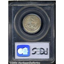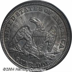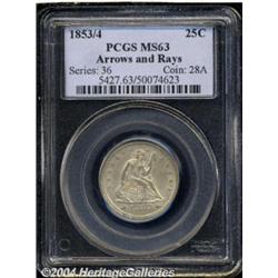 <B>1853/4<25C> Arrows and Rays MS63 PCGS.</B></I> FS-003. Briggs 1-A. In his book on Seated Quarters, Larry Briggs raises some doubt as to this variety's status as an 1853/4 overdate. Under magnification, one can definitely see that the last three digits in the date have been punched over partially effaced underdigits. Remnants of the latter are visible within the upper loop of the 8, along the outside stand of the 5, and within the upper loop of the 3. In addition, the right arrow shaft on the obverse has also been repunched. While the exact identity of the underdigits is open to question, there is no doubt that this is a scarce variety that should be considered a significant find in Mint State. The Select example offered here appear to qualify for Condition Census status. The surfaces are minimally marked for the grade with a glowing, satiny sheen beneath milky golden-tan patina. Population: 6 in 63, 1 finer (6/04). <BR><BR><B>Important notice:</B> Heritage usually auctions material at the rate of 200-250 lots per hour. On some occasions eBay Live bid software or the Internet may not be able to keep up with the pace of the auction. We recommend placing a realistic absentee bid now as insurance to avoid disappointment. Occasionally the auctioneer may eliminate or reject an eBay Live bid, and the auctioneer may also reopen a lot after the close of the eBay live bidding (usually because we missed an audience bid), and may reject your bid even if it shows you as the winning bidder. By bidding via eBay Live, you agree that Heritage may award the lot to another bidder at its sole discretion under the circumstances described above or any other reasonable circumstances. Since eBay bids are not shown to us until we open the lot on the floor, we treat those bids just like floor bids. In most cases the floor responds before the eBay bid is presented to us, due to Internet lag time, so for consistency we have made it a policy that floor bids are always considered first over tie eBay live bids. Also please note that all Heritage lots purchased through eBay Live carry a 20% Buyer's Premium. Please make sure you read the Terms and Conditions before you bid. </span></font></tr></table></td></tr></table>