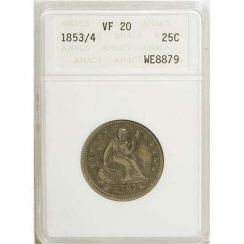 <B>1853/4 25C Arrows and Rays VF20 ANACS.</B></I> NGC Census: (1/25). PCGS Population (3/38). Numismedia Wsl. Price for NGC/PCGS coin in VF20: $180. (#5427)<BR><BR><B>Coin Engraver:</B> Christian Gobrecht<BR><BR><b>Shipping:</b> Coins & Currency (<a target="_blank" href="http://www.heritageauctions.com/common/shipping.php">view shipping information</a>)