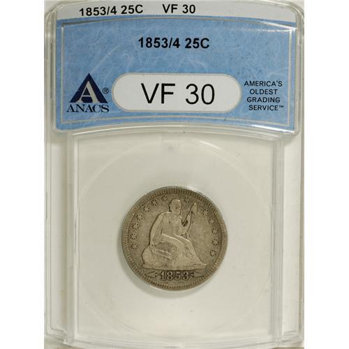 <B>1853/4 25C Arrows and Rays VF30 ANACS.</B></I> NGC Census: (2/26). PCGS Population (6/29). Numismedia Wsl. Price: $284. (#5427)<BR><BR><b>Shipping:</b> Coins & Currency (<a target="_blank" href="http://www.heritageauctions.com/common/shipping.php">view shipping information</a>)