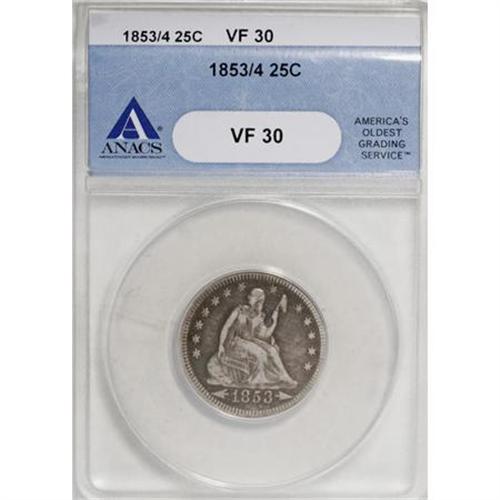 <B>1853/4 25C Arrows and Rays VF30 ANACS.</B></I> NGC Census: (0/26). PCGS Population (6/33). Numismedia Wsl. Price for NGC/PCGS coin in VF30: $284. (#5427)<BR><BR><B>Coin Engraver:</B> Christian Gobrecht<BR><BR><b>Shipping:</b> Coins & Currency (<a target="_blank" href="http://www.heritageauctions.com/common/shipping.php">view shipping information</a>)