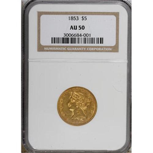 1853 $5 AU50 NGC. NGC Census: (39/313). PCGS Popul