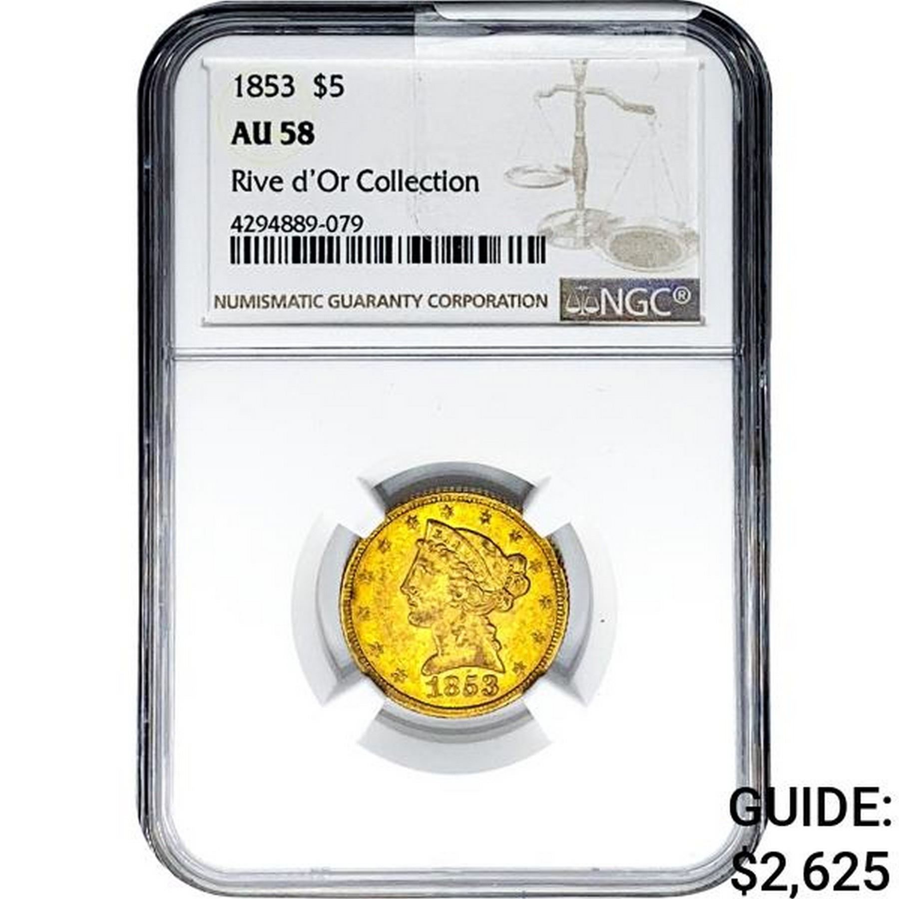 1853 $5 Gold Half Eagle NGC AU58 Rive d'Or COLL.