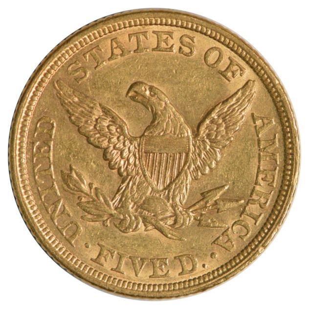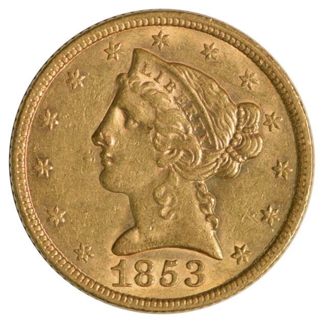 One 1853 $5 Half Eagle Liberty Head Gold Coin.