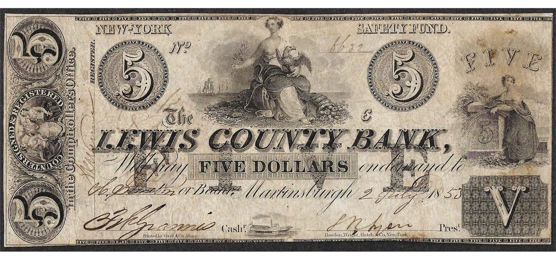 One 1853 $5 Lewis County Bank New York Obsolete Note.