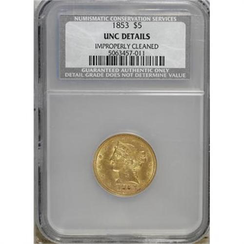 <B>1853 $5 --Improperly Cleaned--NCS. Unc Details.</B></I> NGC Census: (7/70). PCGS Population (3/63). Mintage: 305,770. Numismedia Wsl. Price for NGC/PCGS coin in MS60: $1,400. (#8253)<BR><BR><B>Coin Engraver:</B> Christian Gobrecht<BR><BR><b>Shipping:</b> Coins & Currency (<a target="_blank" href="http://www.heritageauctions.com/common/shipping.php">view shipping information</a>)