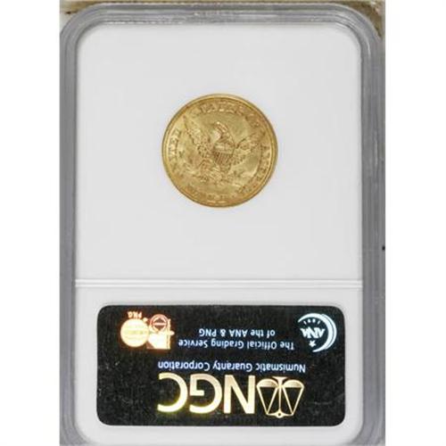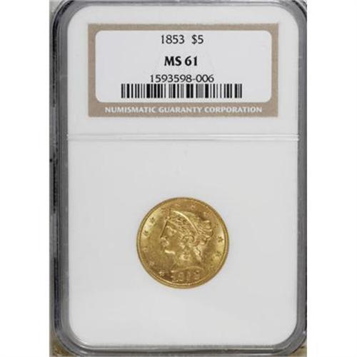 <B>1853 $5 MS61 NGC.</B></I> Highly lustrous surfaces display few marks and benefit from a bold strike. The color is a healthy orange-gold and the eye appeal, especially with regards to the obverse, is great. Like the 1852, the relatively high mintage 1853 is available in circulated grades, yet becomes noticeably scarce in Mint State.<BR><BR><B>Coin Engraver:</B> Christian Gobrecht<BR><BR><b>Shipping:</b> Coins & Currency (<a target="_blank" href="http://www.heritageauctions.com/common/shipping.php">view shipping information</a>)
