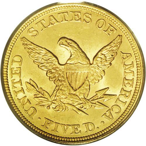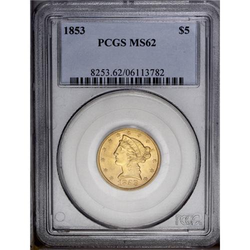 <B>1853<$5> MS62 PCGS.</B></I> Far superior to the usually encountered specimen. This example has a bold strike, save for the fletchings, complemented by gleaming luster. Abrasions are few, and the yellow-gold color is appealing. A small unstruck area on Liberty's highpoint hair is noted. PCGS has graded 33 specimens in MS62, with nine finer (3/06). <BR><BR><B>Important notice:</B> Heritage usually auctions material at the rate of 200-250 lots per hour. On some occasions eBay Live bid software or the Internet may not be able to keep up with the pace of the auction. We recommend placing a realistic absentee bid now as insurance to avoid disappointment. Occasionally the auctioneer may eliminate or reject an eBay Live bid, and the auctioneer may also reopen a lot after the close of the eBay live bidding (usually because we missed an audience bid), and may reject your bid even if it shows you as the winning bidder. By bidding via eBay Live, you agree that Heritage may award the lot to another bidder at its sole discretion under the circumstances described above or any other reasonable circumstances. Since eBay bids are not shown to us until we open the lot on the floor, we treat those bids just like floor bids. In most cases the floor responds before the eBay bid is presented to us, due to Internet lag time, so for consistency we have made it a policy that floor bids are always considered first over tie eBay live bids. Also please note that all Heritage lots purchased through eBay Live carry a 20% Buyer's Premium. Please make sure you read the Terms and Conditions before you bid. This lot is being auctioned in conjunction with a live floor auction by Heritage Galleries & Auctioneers. All final auction and invoice information will be supplied by Heritage Galleries & Auctioneers, and all other information should be considered preliminary. Lot:2714 <BR><BR><B>Winning Notification and Billing:</B> After the FINAL session in this auction is complete, Heritage will send e-mail and snail mail invoices. This process normally takes several days. All final auction and invoice information will be supplied by Heritage Galleries & Auctioneers, and all other information should be considered preliminary. <BR><BR>This auction will be conducted on a live auction floor and over the Internet through eBay Live. If you choose to place an absentee bid, please take a moment to <font color='#0000ff'><u><a href='http://pages.ebay.com/liveauctions/help/before/laabsentee.html'>learn how eBay Live absentee bidding works</a></u></font><font color='#000000'>