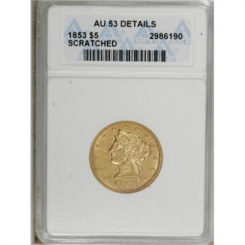 <B>1853 $5 --Scratched--ANACS. AU53 Details.</B></I> NGC Census: (40/273). PCGS Population (14/121). Mintage: 305,770. Numismedia Wsl. Price for NGC/PCGS coin in AU53: $272. (#8253)<BR><BR><b>Shipping:</b> Coins & Currency (<a target="_blank" href="http://www.heritageauctions.com/common/shipping.php">view shipping information</a>)