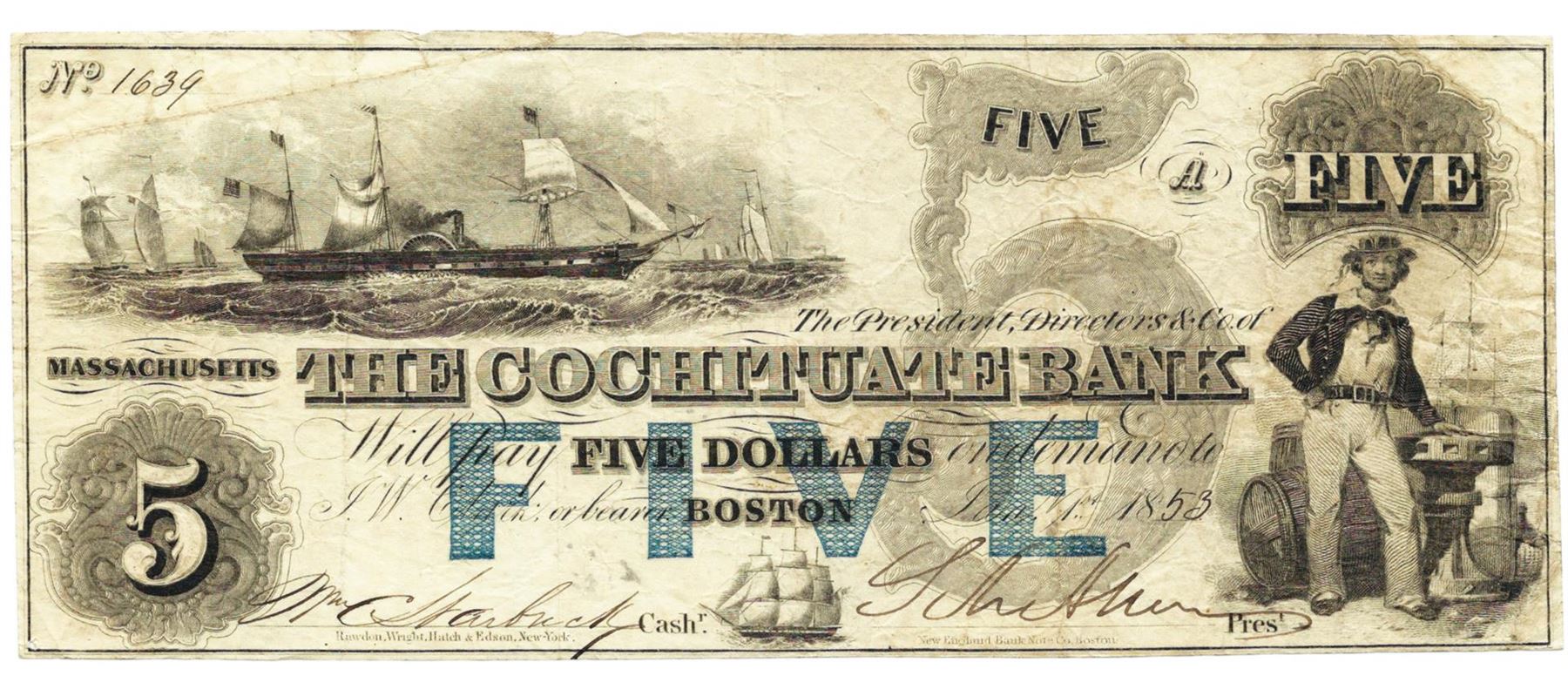 One 1853 $5 The Cochituate Bank, Boston, MA Bank Note