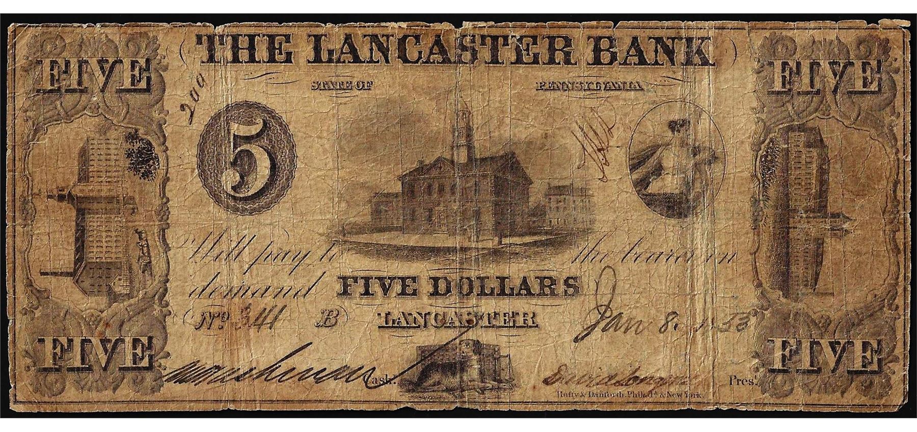 One 1853 $5 The Lancaster Bank Lancaster, PA Obsolete Note.
