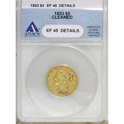 <B>1853 $5 --Cleaned--ANACS. XF45 Details.</B></I> NGC Census: (26/361). PCGS Population (49/169). Mintage: 305,770. Numismedia Wsl. Price for NGC/PCGS coin in XF45: $234. (#8253)<BR><BR><B>Coin Engraver:</B> Christian Gobrecht<BR><BR><b>Shipping:</b> Coins & Currency (<a target="_blank" href="http://www.heritageauctions.com/common/shipping.php">view shipping information</a>)