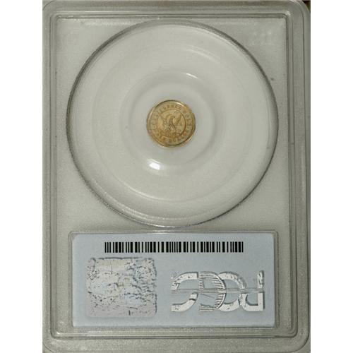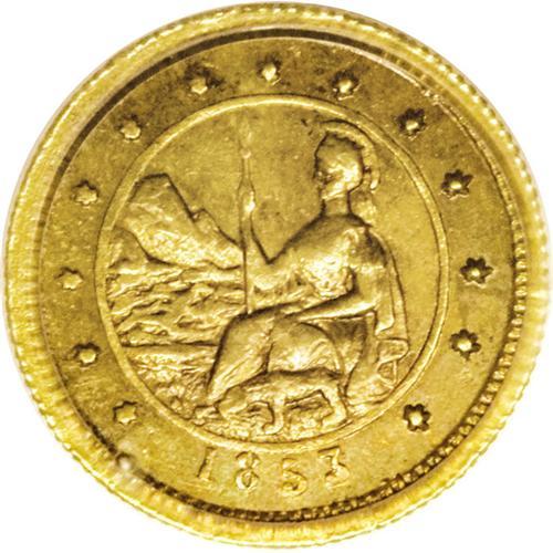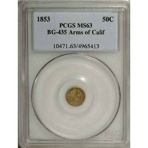 <B>1853 50C Arms of California 50 Cents, BG-435, Low R.5, MS63 PCGS.</B></I> The "Arms of California" is one of the most famous California small denomination gold varieties. It appears only on BG-435. The importance of this variety is cemented by the appearance of both sides on the back of the second edition of Breen-Gillio, the only variety shown on the back. It is also the only variety to have both sides depicted on the front of the Jay Roe collection catalog. The obverse, of course, is based on the California state arms. The reverse imitates the eagle, ribbon, and shield seen on the Assay Office gold coins still in production in 1853. The maker of this unique type is unknown. The present piece has apricot, olive, and mauve toning. Nicely struck and unabraded with a couple of faint reverse laminations, as produced.<BR><BR><b>Shipping:</b> Coins & Currency (<a target="_blank" href="http://www.heritageauctions.com/common/shipping.php">view shipping information</a>)