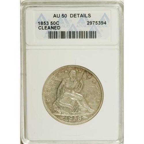 <B>1853 50C Arrows and Rays--Cleaned--ANACS. AU50 Details.</B></I> NGC Census: (44/516). PCGS Population (66/459). Mintage: 3,532,708. Numismedia Wsl. Price for NGC/PCGS coin in AU50: $450. (#6275)<BR><BR><b>Shipping:</b> Coins & Currency (<a target="_blank" href="http://www.heritageauctions.com/common/shipping.php">view shipping information</a>)