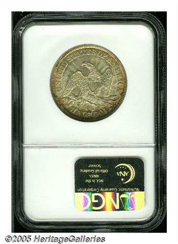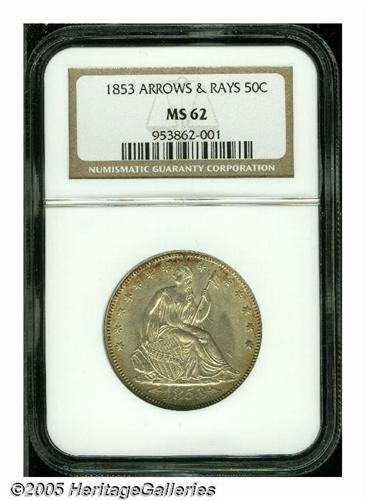 <B>1853<50C> Arrows and Rays MS62 NGC.</B></I> Apparently large numbers of Arrows and Rays Quarters and Halves were saved at the time of issue, as these pieces are plentiful in lower grades. However, in high grades they are quite elusive and always worthwhile for type collectors. This piece is light in color near the centers, with deeper, russet shadings near the peripheries. Sharply struck with no obvious or distracting abrasions.<BR><I>From The Melrose Bay Collection.</B></I>