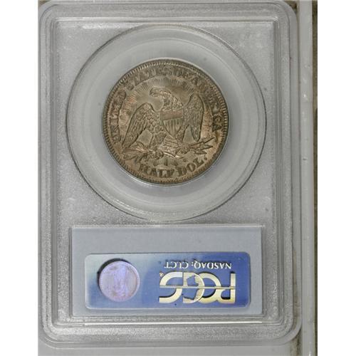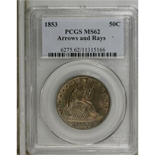 <B>1853 50C Arrows and Rays MS62 PCGS.</B></I> UNITED STATES is die doubled, most clearly on the E in UNITED. Probably FS-50-1853-801 (former FS-004.7), although the <I>Cherrypickers' Guide</B></I> lists four doubled die reverses with similar diagnostics. Splashes of sea-green and peach toning enrich the subdued but smooth surfaces. A popular single-year type.<BR><BR><b>Shipping:</b> Coins & Currency (<a target="_blank" href="http://www.heritageauctions.com/common/shipping.php">view shipping information</a>)