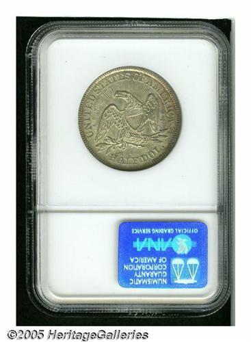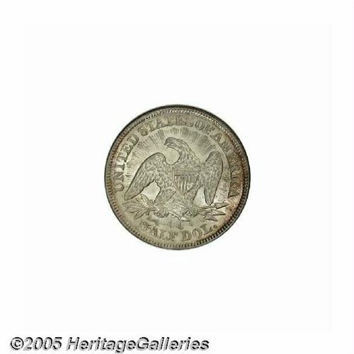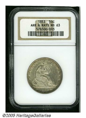 <B>1853<50C> Arrows and Rays MS63 NGC.</B></I> Although comparatively obtainable in average to Choice Uncirculated grades, this issue's one-year type status places far greater importance on surviving Mint State examples. This Select representative is boldly defined, displays shimmering luster, and is framed in attractive coppery-gold toning.