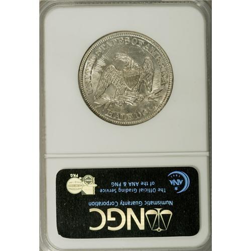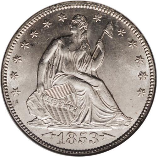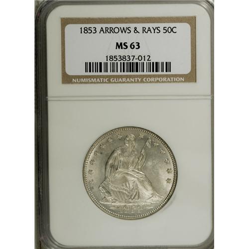 <B>1853 50C Arrows and Rays MS63 NGC.</B></I> While many numismatists consider the rays around the eagle to be a pleasing addition to the design, some scholars speculate that the rays decreased reverse die life, and so the issues of 1854 and 1855 had arrows only. The present piece is highly lustrous and has a suitable strike. Occasional spots of charcoal patina appear on the silver-gray surfaces, and light abrasions define the grade.<BR><BR><b>Shipping:</b> Coin/Currency (<a target="_blank" href="http://www.heritageauctions.com/common/shipping.php">view shipping information</a>)