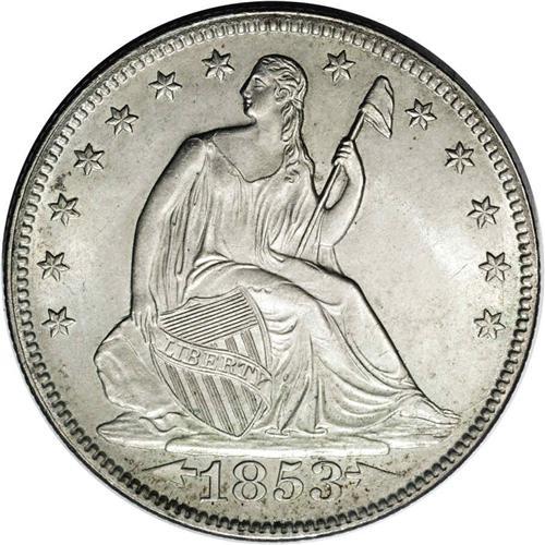 <B>1853<50C> Arrows and Rays MS64 NGC.</B></I> Light olive-gold in color, this impressive Choice type coin features creamy mint luster and an intricate strike. A single small reeding mark on the thigh, otherwise magnificently void of contact. The Arrows and Rays type was produced only in 1853; the dramatic Rays probably reduced reverse die life. Arrows remained on the obverse through 1855. Although struck in generous quantities to replenish hoarded old tenor silver, the 1853 is important for type purposes, and relatively few pieces have survived in better Mint State grades.